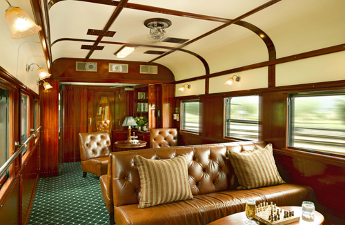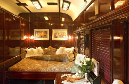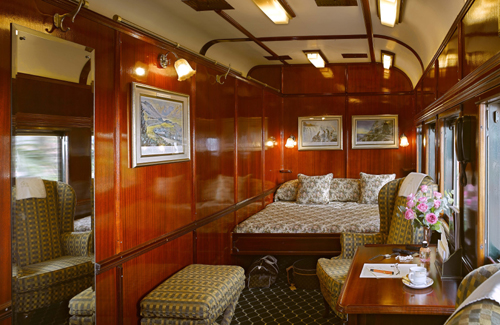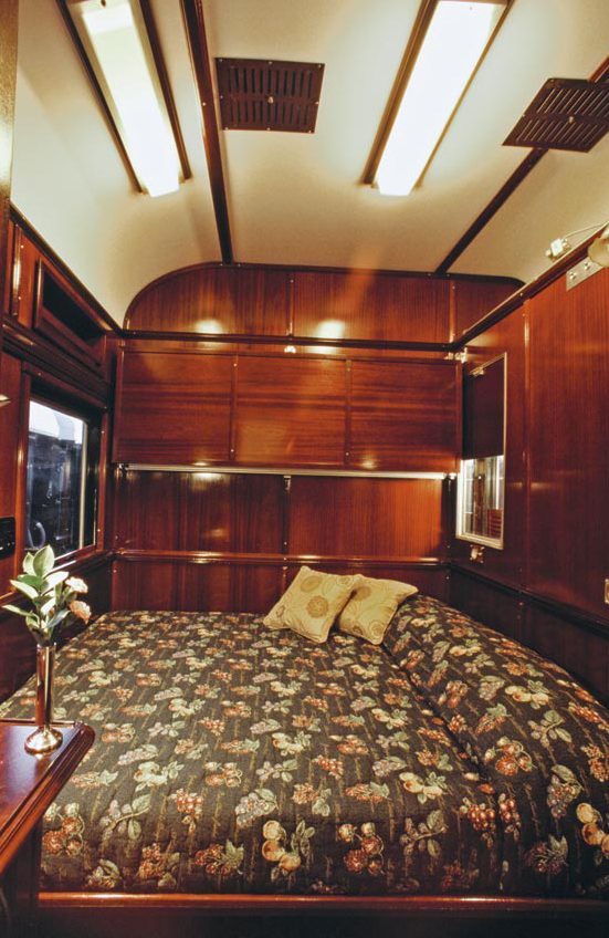 The rebuilt sleeper coaches contain the most spacious train suites in the world, offering every modern convenience and comfort. The epitome of luxury, with handsome wood paneling and period Edwardian features, the air-conditioned suites accommodate two people offering the option of twin or spacious double beds. All are equipped with a writing surface and, for valuables, a personal safe. There is also a bar fridge filled with beverages of the passengers’ choice and room service is available 24 hours a day. In the en suite bathrooms original fittings combine with the modern technology of hot showers, hair dryers and shaver plugs. There are three levels of accommodation available. The Royal Suites, each of which take up half a carriage, are spacious and elegant, measuring about 16 sq meters in size (172 sq ft). Each has its own private lounge area and full bathroom with Victorian bath and separate shower. The Deluxe Suites (approx. 11 sq meters/118 sq feet) also accommodate two passengers in either twin or double beds and have a lounge area and en-suite bathroom with shower. A third level of accommodation, the Pullman Suite, is approximately 7 square meters (76 sq feet) in size and while it will include the identical bathroom to that of the deluxe suites, the bedroom will be smaller with a one up one down bed for twin requirements or a double bed for couples. During the day this can be converted into a comfortable couch. Please see our “Photo Gallery” for pictures of all suites.